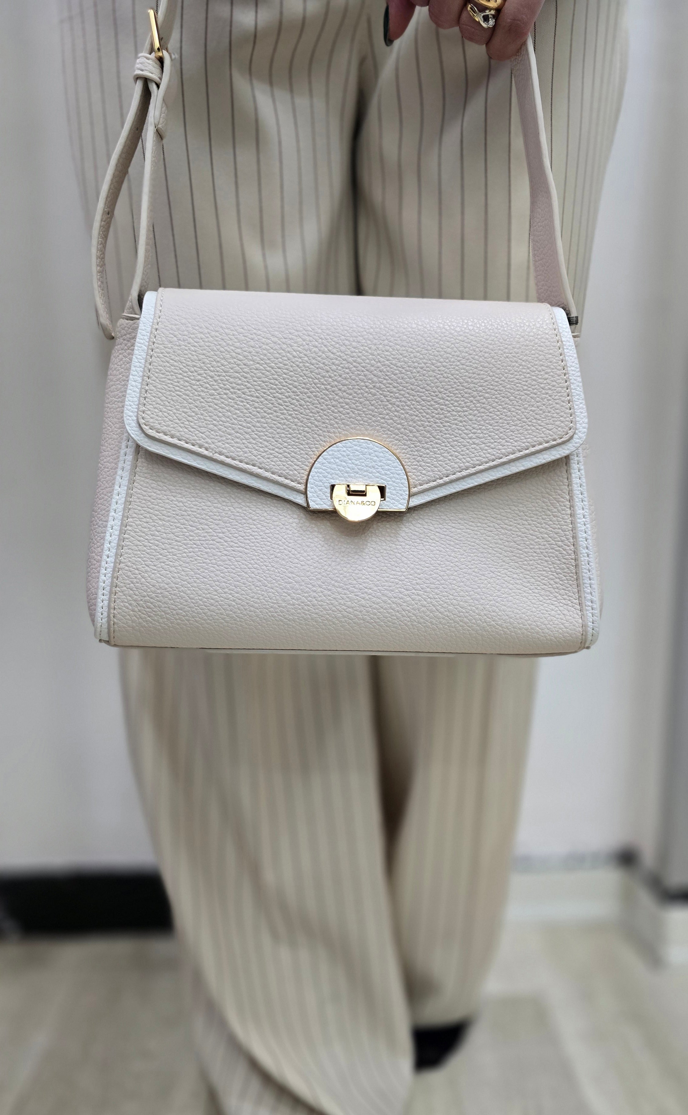 Borsa in ecopelle a lettera con tracolla ,chiusura frontale piu zip interna ,rifinitura in bianco.