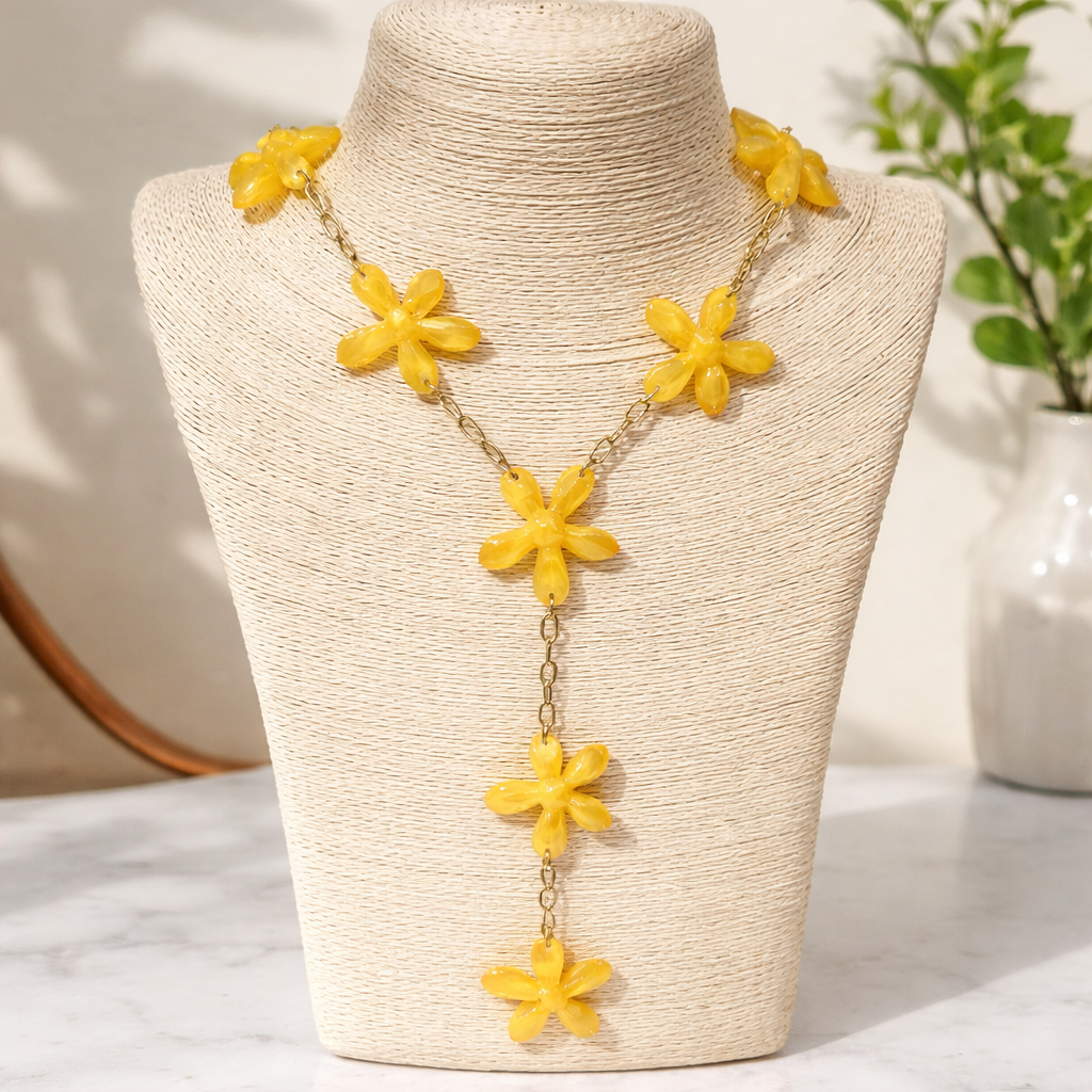 Collana modello lariat caratterizzato da elementi floreali in resina .Il design alterna fiori a catenina dorata ,moschettone regolabile