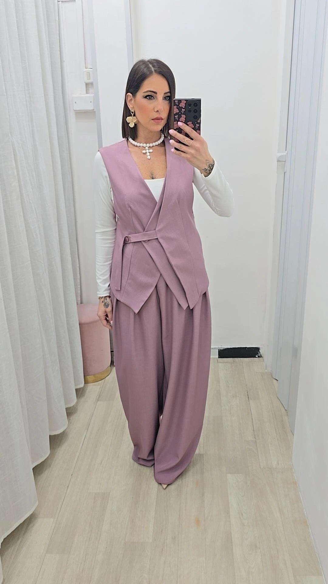 Raffinato coordinato  composto da un gilet sartoriale e pantaloni a gamba larga. Caratterizzato da un design incrociato...