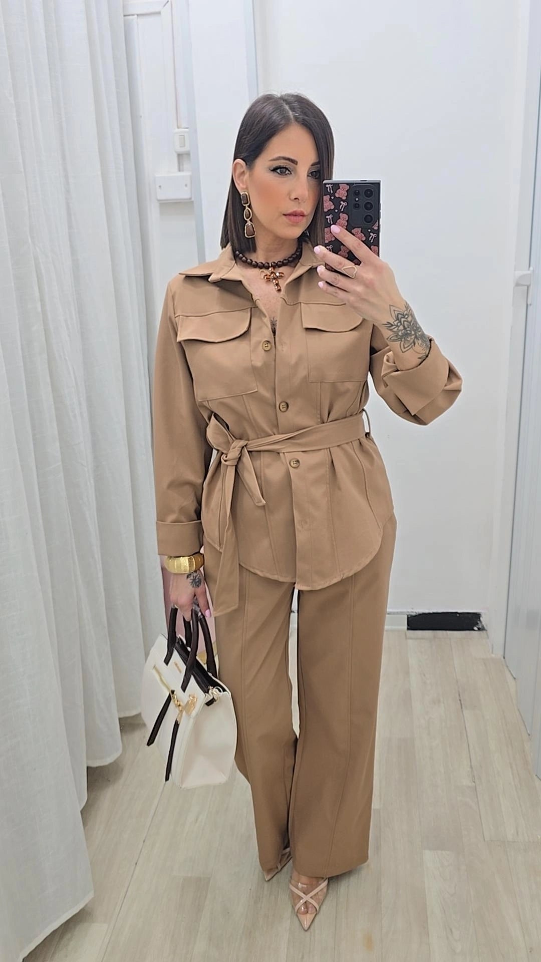 Coordinato composto da  camicia stile safari e pantaloni a gamba larga in una tonalità beige/cammello.  La parte...