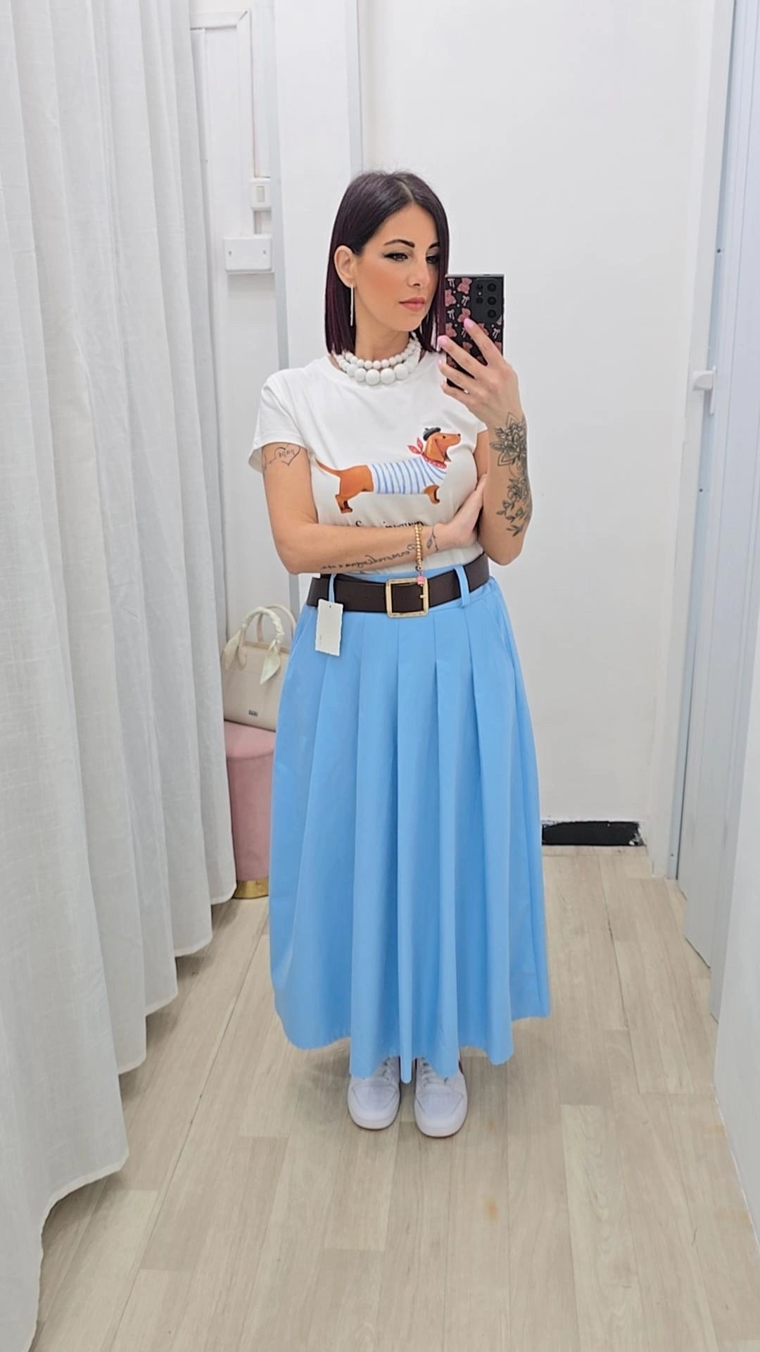 Gonna vita alta si distingue per il suo colore azzurro vivace e il raffinato design a pieghe, perfetto per un look primaverile