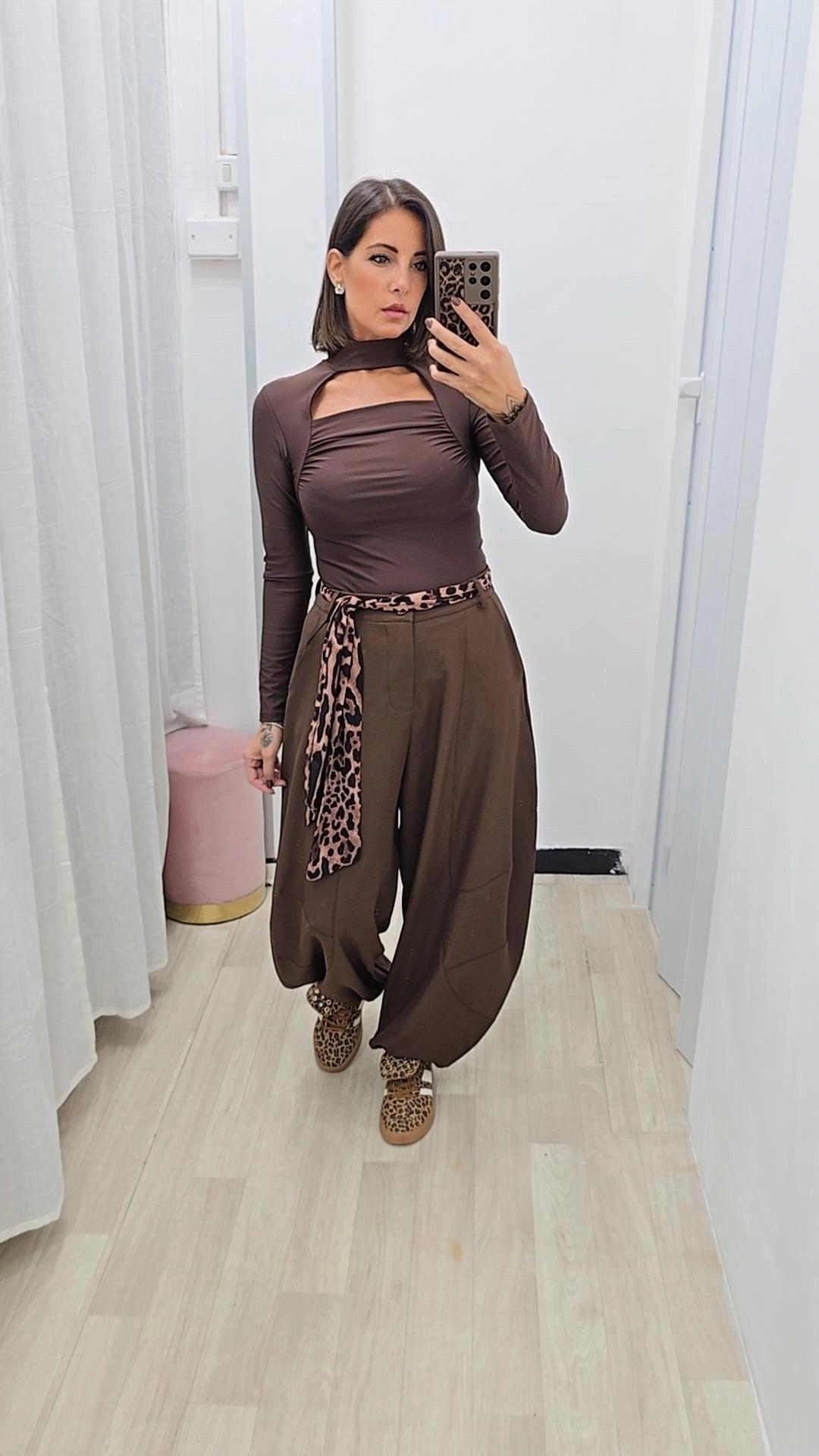 Pantalone modello ballon con fusciacca maculata inclusa.