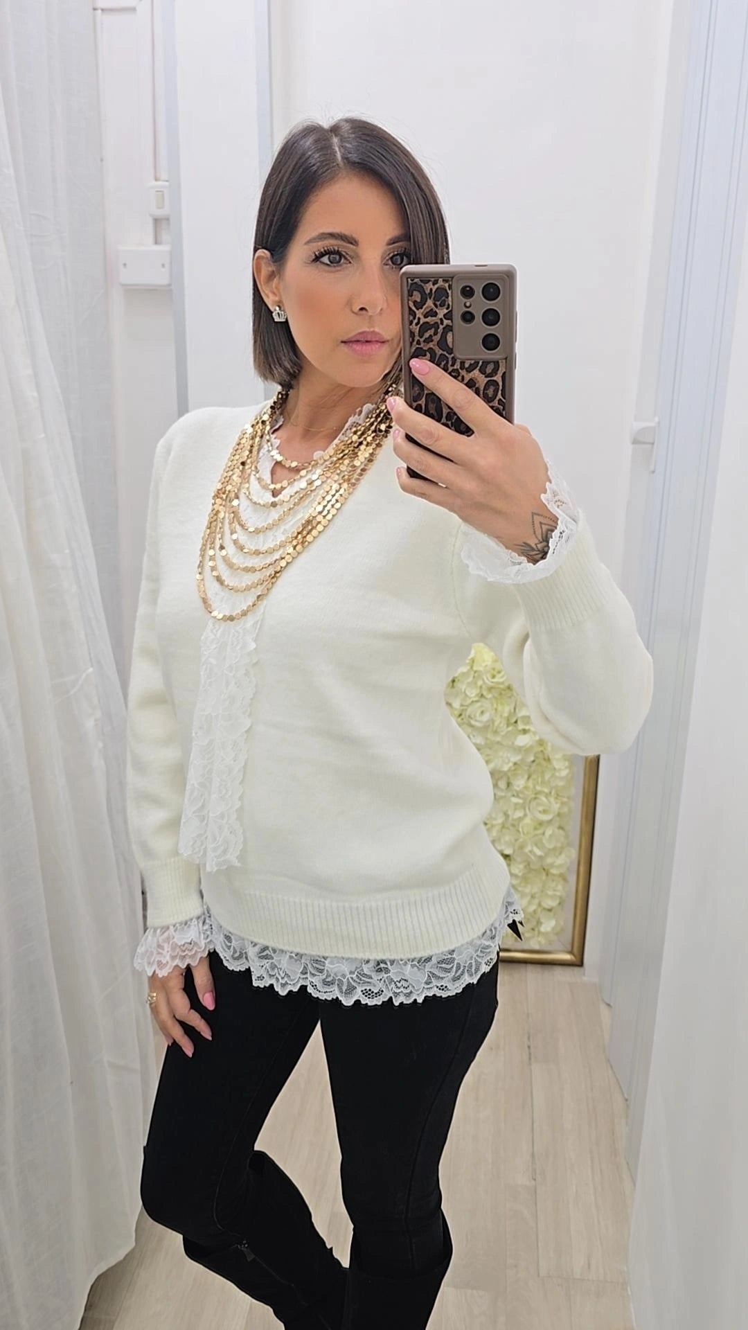 Pullover monocolore  scollo a V  dettaglio di pizzo sul fondo, sui polsini e vicino alla scollatura  taglia...