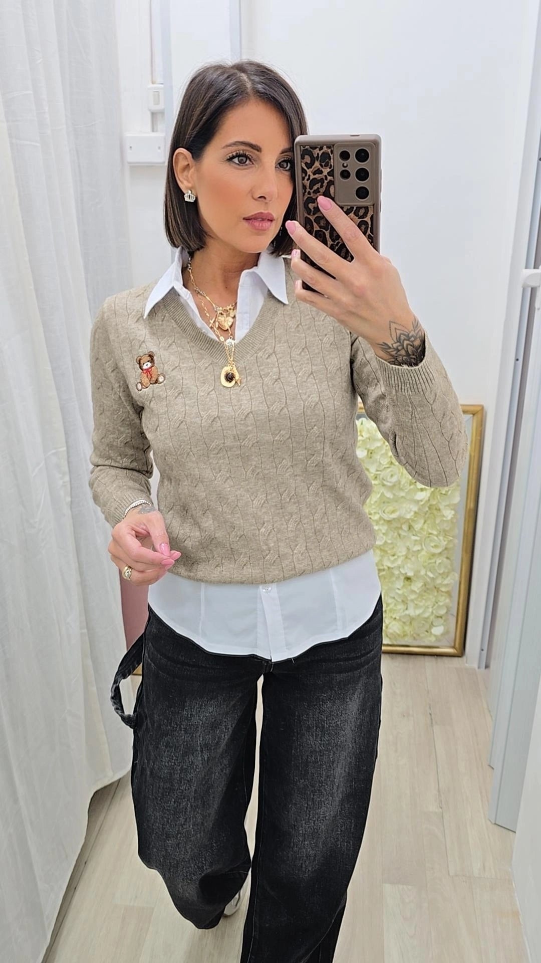 Pullover con trama treccia  lana rasata  scollo a V  orso ricamato lateralmente  taglia unica vestibilità slim  consigliato...